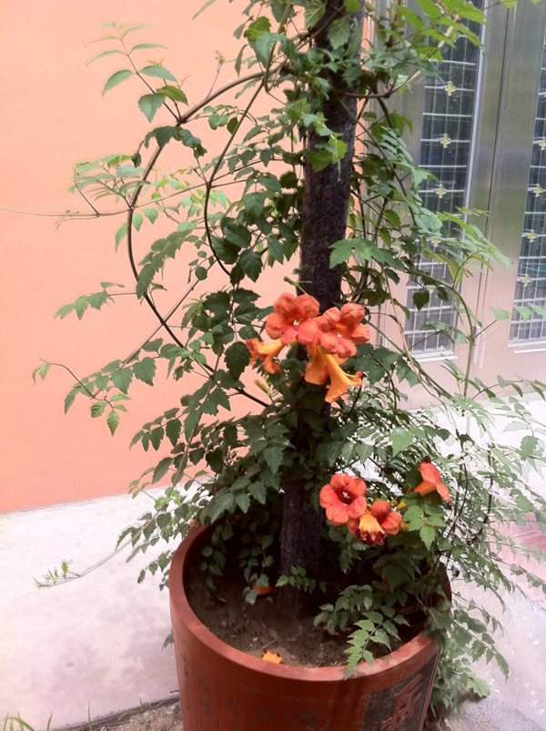 因為凌霄花很皮實,用其枝干扦插上盆就可成活,培育成觀花盆景,別有風味。所以盆栽的重點不在于如何養活它,而在于如何養好它,下面有幾點凌霄花盆栽的日常養護要點,供花友參考。